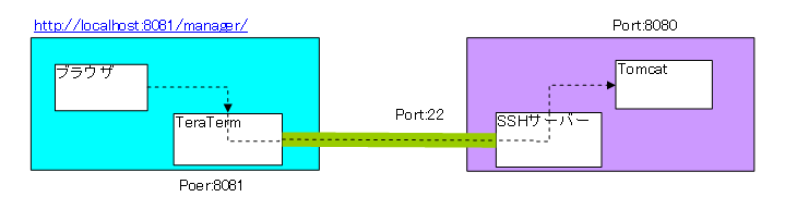 仕組みは下図のようになります。SSHの中を別のプロトコル(http)が通る事から、TCPトンネルと言う場合もあります。