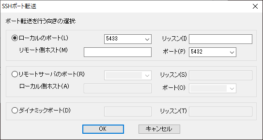 ここに、ローカル側の使われていないポート番号とサーバー(=リモート)側のポートを設定します。